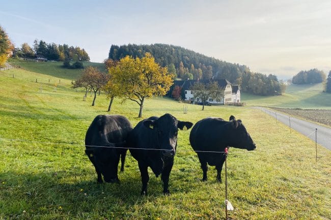 Während die Mama‘s die letzten Herbsttage noch die Obstgartenwiese zusammengrasen dürfen, wurde vor einer Woche der Stall erstmals zweigeteilt und die 3 Kälber sind in den „Jugendstall“ übersiedelt!
